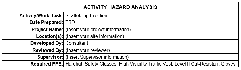 From the first base plate to the final safety check, this AHA ensures scaffolding erection is completed safely, efficiently, and in accordance with OSHA and industry best practices.